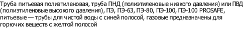 Труба питьевая полиэтиленовая, труба ПНД (полиэтиленовые низкого давления) или ПВД (полиэтиленовые высокого давления), ПЭ, ПЭ-63, ПЭ-80, ПЭ-100, ПЭ-100 PROSAFE, питьевые — трубы для чистой воды с синей полосой, газовые предназначены для горючих веществ с желтой полосой