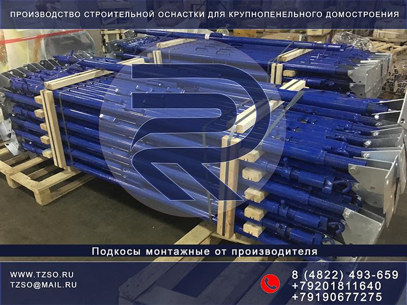 Монтажный подкос или крюк-крюк– это жесткая конструкция без собственных свойств устойчивости. Действует на линейное сжатие и используется для фиксирования элементов в установленной позиции. Это универсальное и распространенное приспособления для крепления невысоких колонн, элементов перегородки, панелей и прочих сборочных компонентов до финального проектного монтажа.Также применяется в каркасно-монолитных постройках.Несущие элементы производятся в соответствии с нормативами ГОСТ для соблюдения коэффициента стойкости.