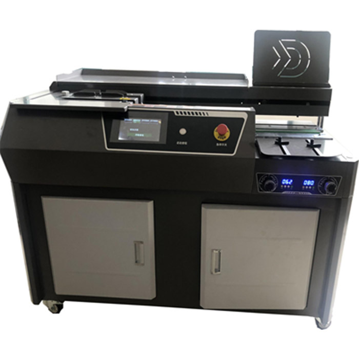 Обложка укладывается на платформу с регулировкой формы корешка, справа на рабочем столе. Позиционирование точное, так как предусмотрено два упора со стороны наезда платформы с бумагой и один боковой упор. Пачка бумаги, толщиной не более 6 см, укладывается вертикально в пресс, где фиксируется боковыми тисками. После этого оператор запускает операцию, и платформа с прессом протягивает корешок через исполнительные инструменты по длине рабочего стола. Первоочередно корешок подрезается фрезой с дополнительными высокопрочными торширующими лезвиями, над которой действует первая пара защитно-позиционирующих роликов; мусор снимает поперечная щетка. Далее выполняется нанесение клея по бокам переплета; сверху установлена вторая пара таких же роликов. Основное нанесение клея по торцу переплета делается главным валом с рельефной поверхностью; излишки клея снимает поперечная планка. Когда стопка заводится над обложкой, та приподнимается и удерживается серединой к корешку, при этом боковые фиксаторы на платформе обложки смыкаются, прижимая так бумагу по боковой длине.