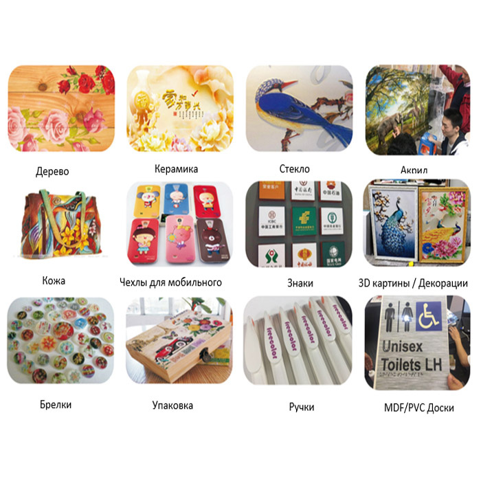 - Материалы для печати: все виды поверхностей, таких как стекло, дерево, металл, плитка, дерево, пластик и т.д.
