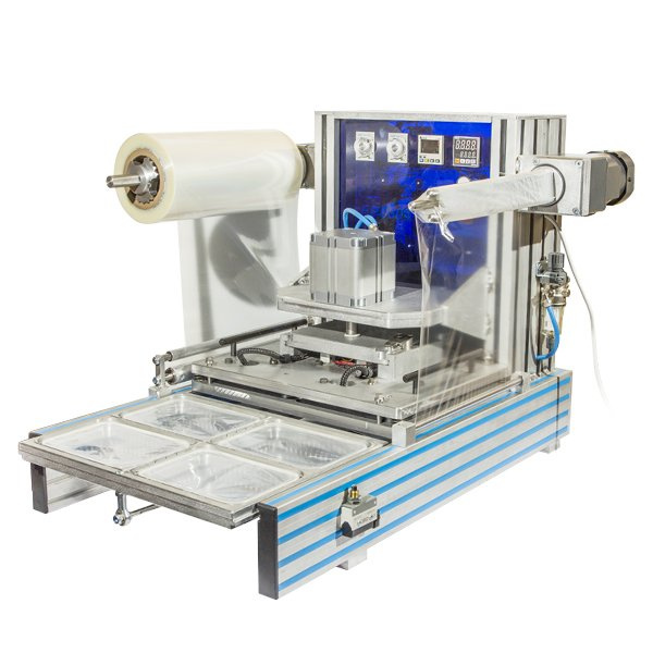 Оператор устанавливает лоток с продуктом на подвижный стол, который находится в зоне загрузки/выгрузки, нажимает педаль, происходит перемещение лотка в рабочую зону аппарата. Далее аппарат запаивает лоток с вырубкой плёнки по контуру лотка. После запайки лоток перемещается из рабочей зоны аппарата в зону загрузки/выгрузки. В это время происходит перемотка плёнки.