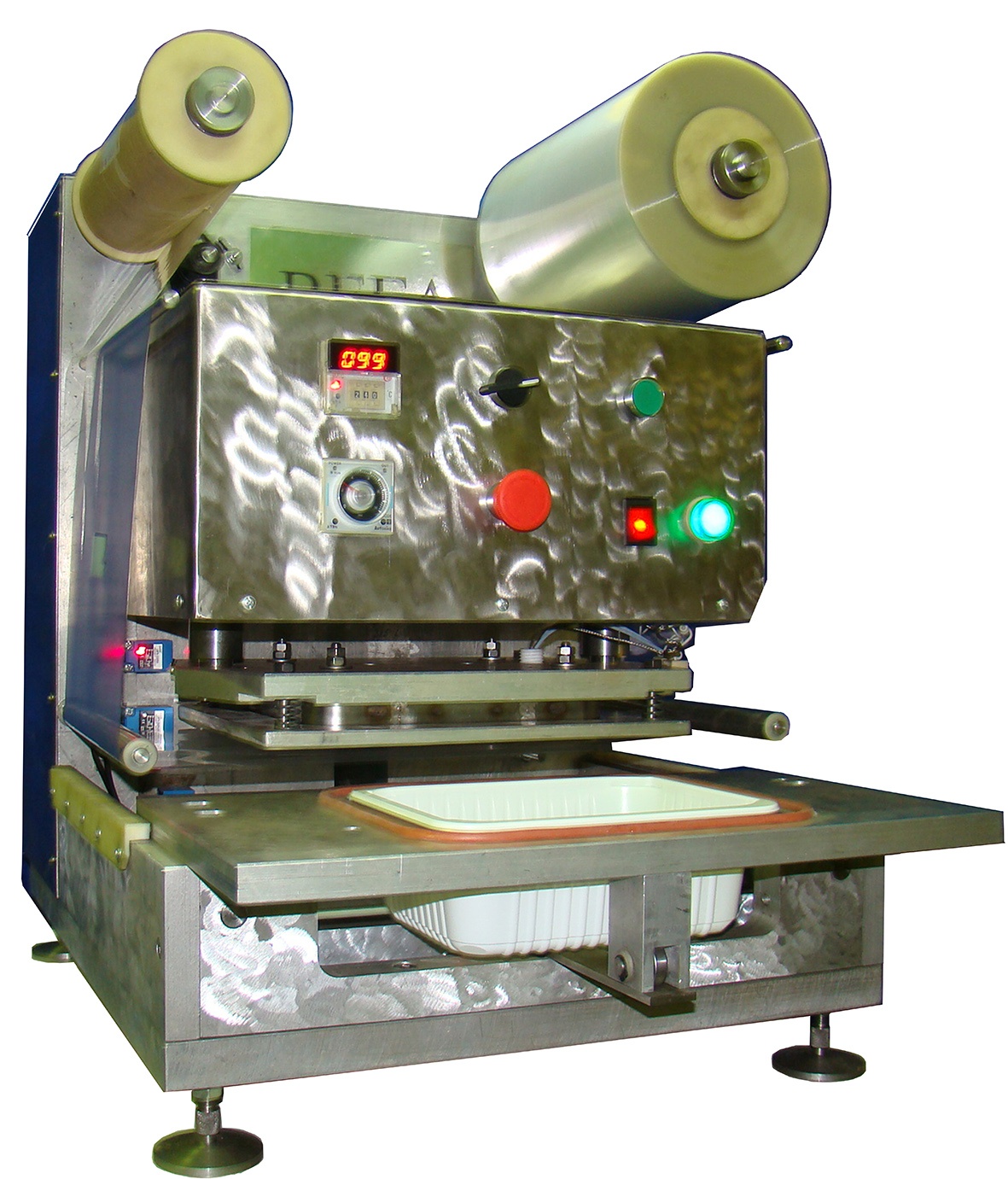 запайщик лотков или контейнеров модели ВЕГА 1Г 300 предназначен для герметичной запайки лотков и контейнеров плёнкой с вырубкой по контуру лотка. Привод аппарата - пневматический. Аппарат предназначен для герметичной упаковки полуфабрикатов из мяса и птицы, рыбных пресервов, кондитерских изделий, молочных продуктов, салатов, готовых блюд и т.д., что обеспечивает значительное увеличение срока хранения упаковываемого продукта.