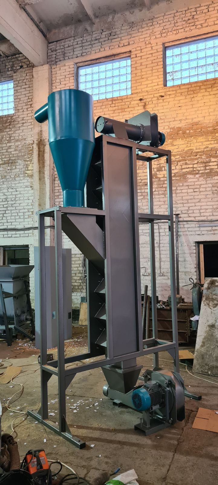 Воздушный разделитель применяют для отделения мелких частиц, волокон, пыли, бумаги от основного сырья. Предварительно измельченное сырье подается на вход циклона загрузки сырья и далее, через бункер загрузки в трубу воздуховода воздушного разделителя.