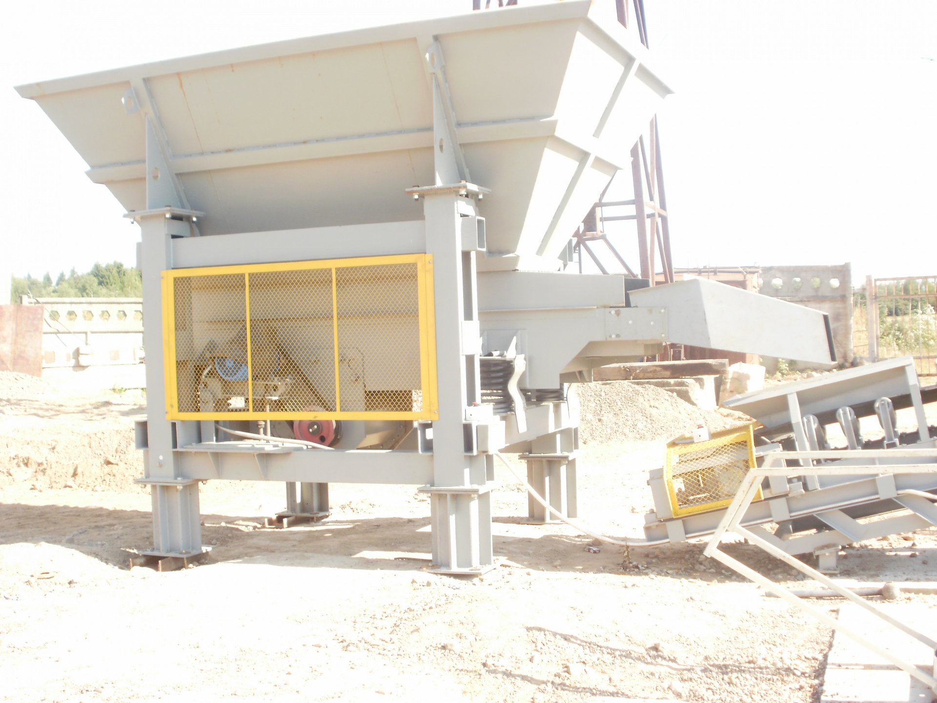 Питатель вибрационный АПВ-08 (агрегат, на металлоконструкции) предназначен для равномерной выдачи сыпучих материалов из бункера в дробилки или транспортирующие устройства. Емкость бункера 7 м3. Производительность 10…95 м3/ч, в значительной мере зависит от размеров и свойств подаваемой породы. Производительность питателя может регулироваться путем изменения инерционной силы, развиваемой дебалансами, за счет изменения количества пластин, прикрепляемых к дебалансам вибратора. Максимальный размер кусков питания 340 мм. Ширина лотка 800мм. Габаритные размеры 4160х2650х2830 мм. Высота от плоскости опорного основания до уровня загрузки питателя 2830мм. Мощность электродвигателя 7,5кВт. Масса 5,5 т.