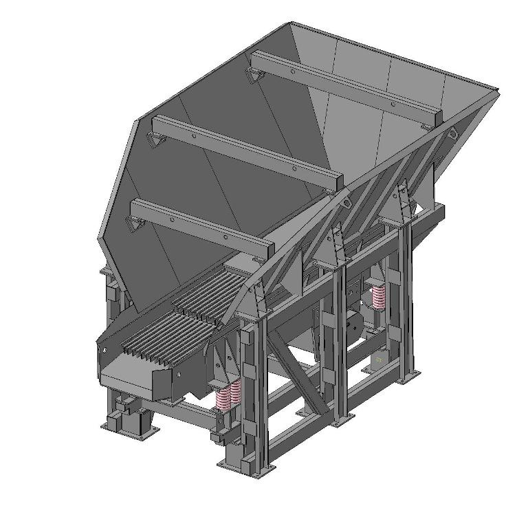 Питатель вибрационный АПВ-12 (агрегат, на металлоконструкции) предназначен для равномерной выдачи сыпучих материалов из бункера в дробилки или транспортирующие устройства.Емкость бункера вибропитателя 17 м3. Производительность 40…250 м3/ч, в значительной мере зависит от размеров и свойств подаваемой породы. Производительность питателя может регулироваться путем изменения инерционной силы, развиваемой дебалансами, за счет изменения количества пластин, прикрепляемых к дебалансам вибратора. Максимальный размер кусков питания 680 мм. Ширина лотка 1200мм, с колосниками. Мощность электродвигателя 18,5 кВт. Габаритные размеры 6000х3600х3800 мм. Масса не более 14 т. Вибропитатели АПВ-12 могут быть доукомплектованы как нижней, так и верхней колосниковой решеткой. Верхняя колосниковая решетка служит для удаления негабарита в небольших объемах. Длина нижней колосниковой решетки 2400мм. Мелкий материал, который просеивается через колосниковую решетку, попадает непосредственно на разгрузочный транспортер агрегата, минуя первичную дробилку.Шаг нижней колосниковой решетки 40…250мм.