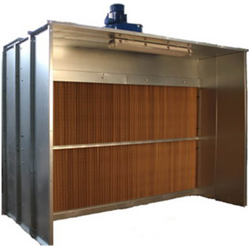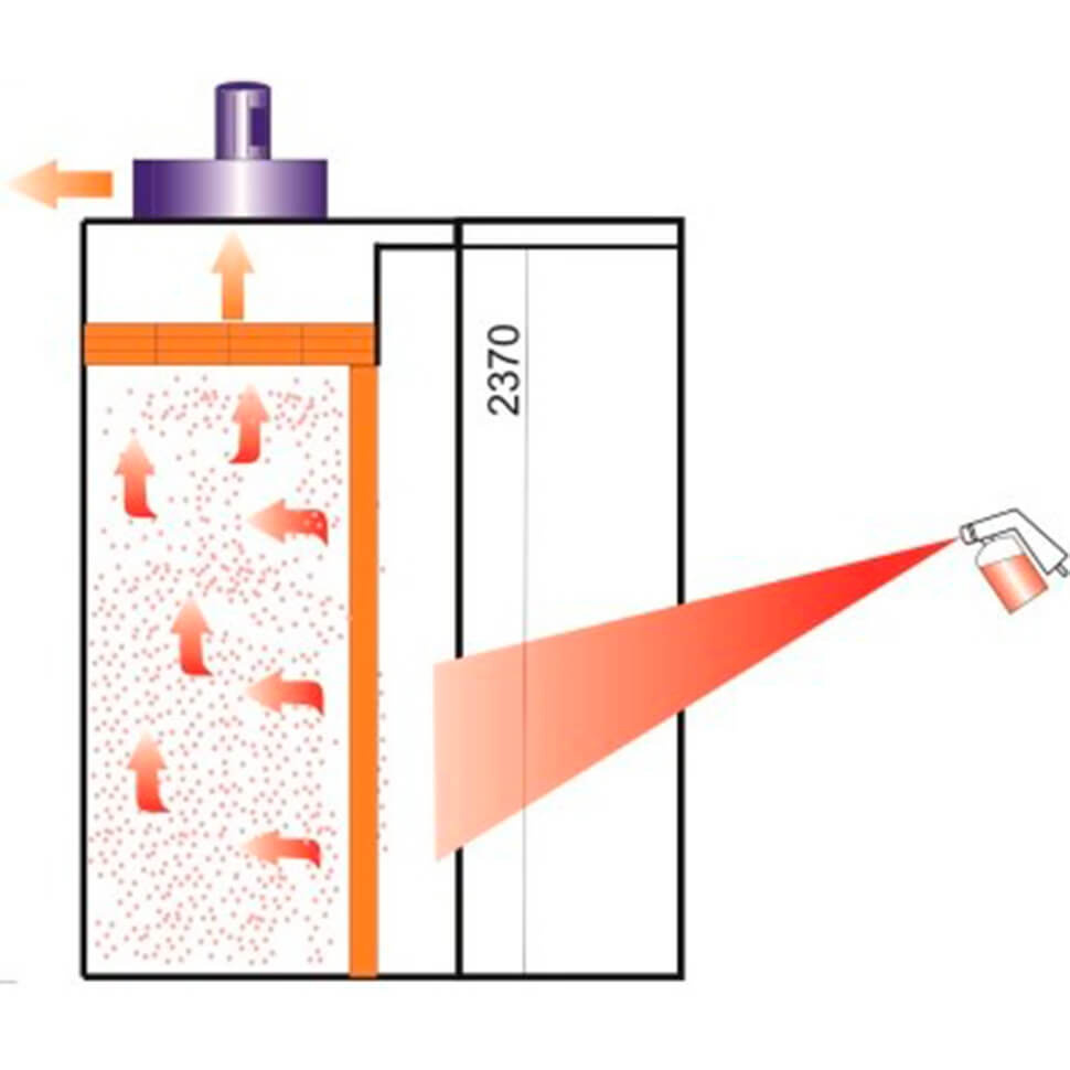 Часть распыленного маляром лакокрасочного материала не попадает на изделие. При этом в воздухе образуется мелкая пыль из быстросохнущих компонентов лака – перепыл, который благодаря окрасочной кабине удаляется из рабочей зоны параллельным полу потоком воздуха. Существенная часть лаковой пыли осаждается на картонном лабиринтном фильтре (до 75 — 95 %). Причем по мере загрязнения фильтра степень фильтрации увеличивается. Дополнительная система фильтрации (опция) – быстросъемные кассеты с недорогим сменным элементом – стекловолоконным фильтром позволяют достичь степени очистки от твердых частиц вплоть до 95 %. Преимуществом сухой покрасочной камеры являются: