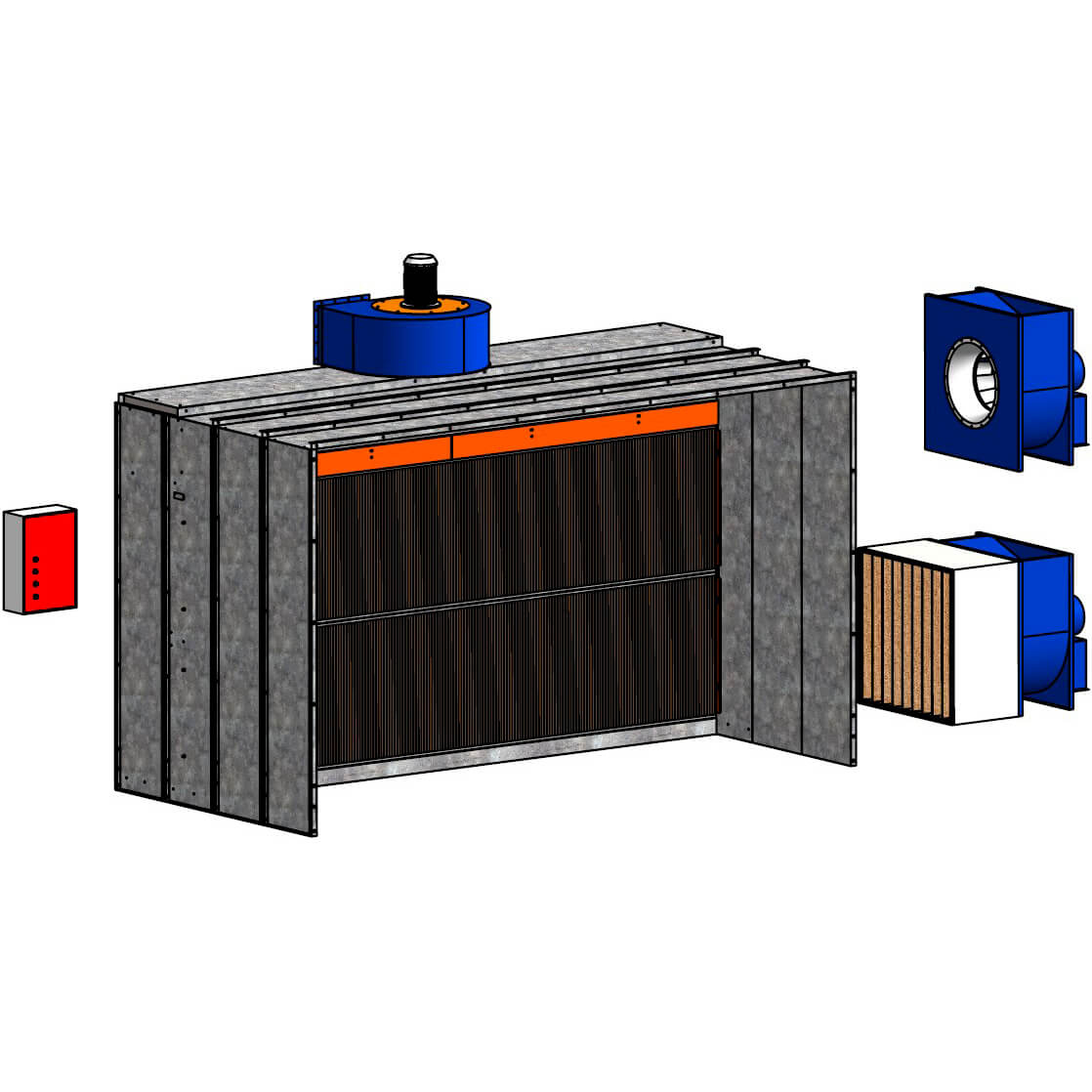 Сборный корпус из оцинкованной стали с большим количеством продольных, поперечных и вертикальных ребер жесткости. Обеспечивает долговечность эксплуатации и снижение вибрации в процессе работы. Корпус камеры закрывает внутренний объем с 5-ти сторон, в отличие от аналогов, у которых вместо нижней герметизирующей панели используется пол цеха.