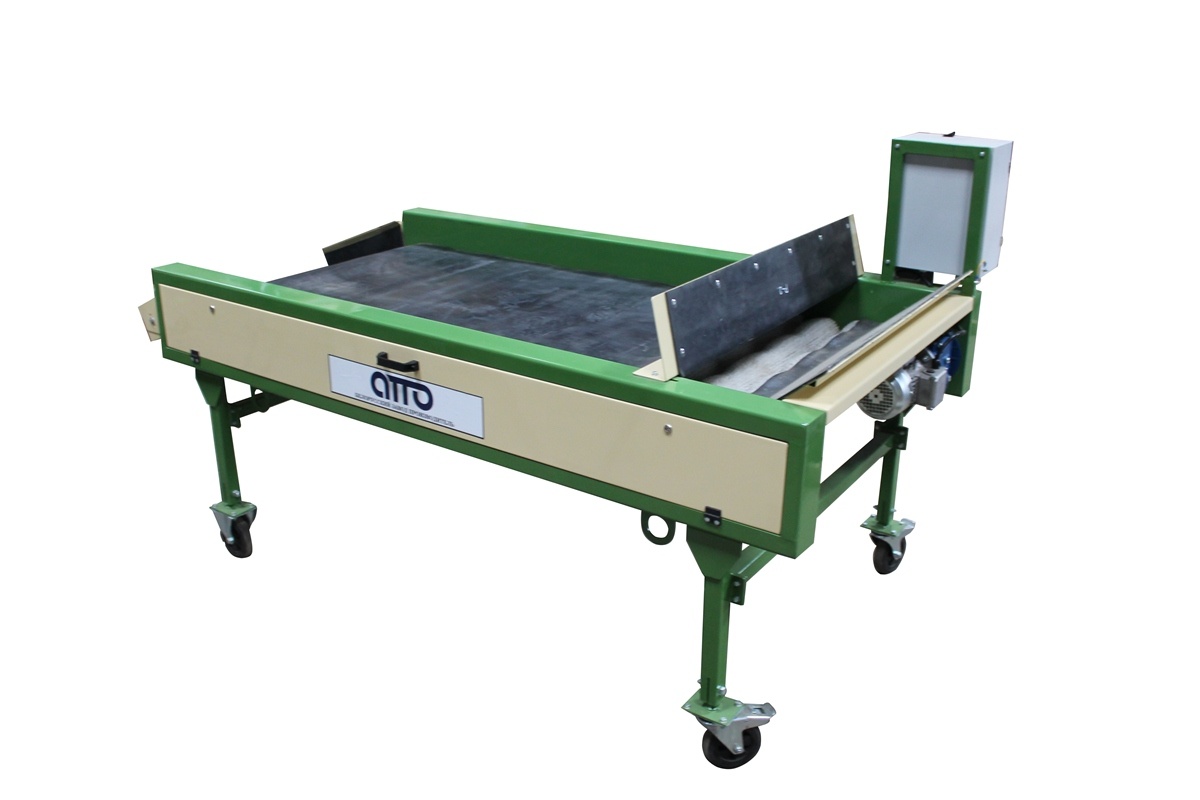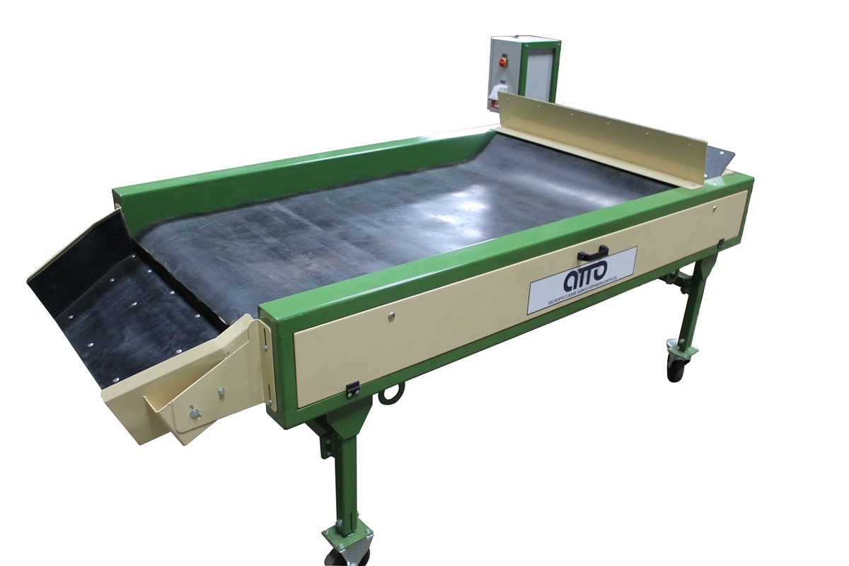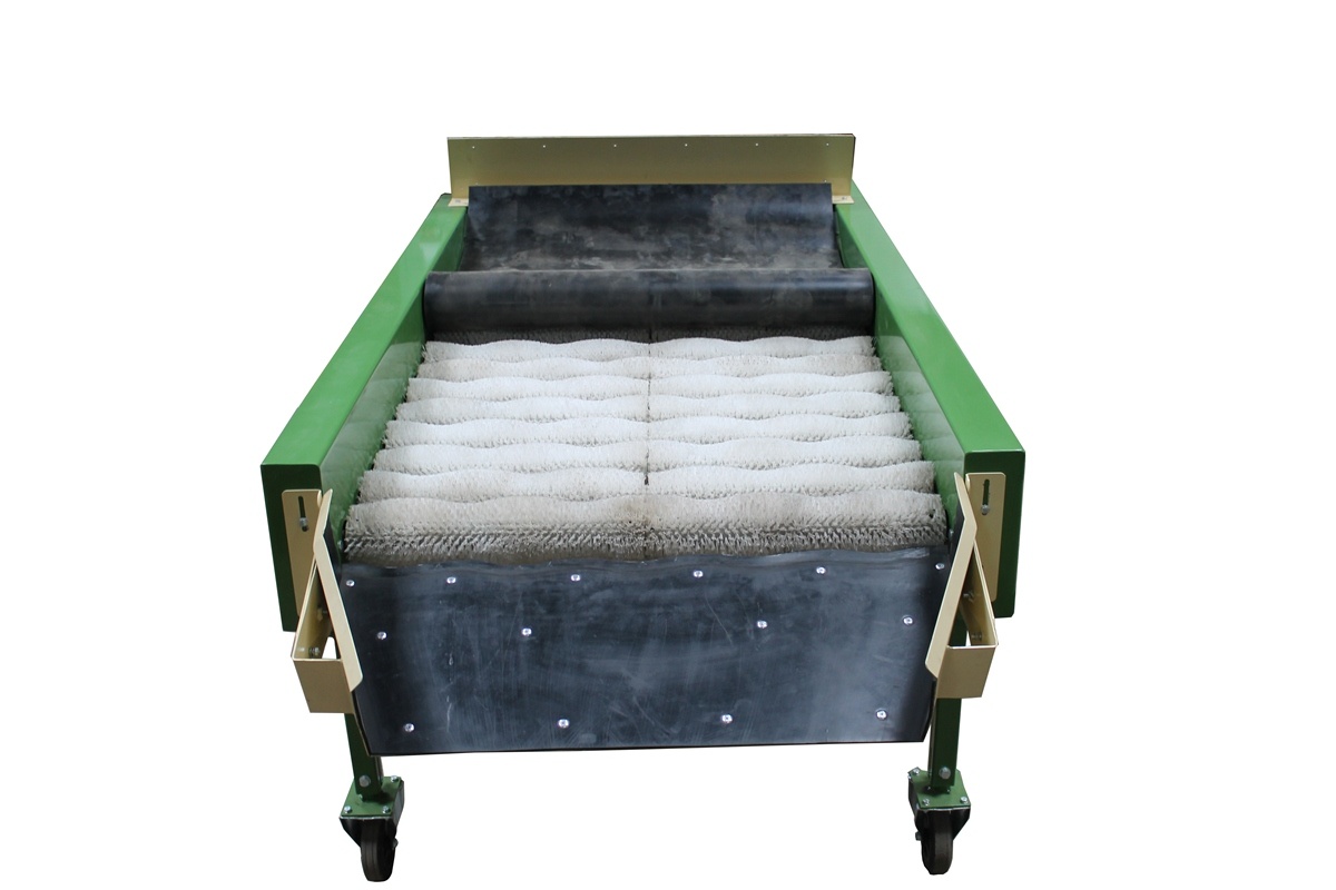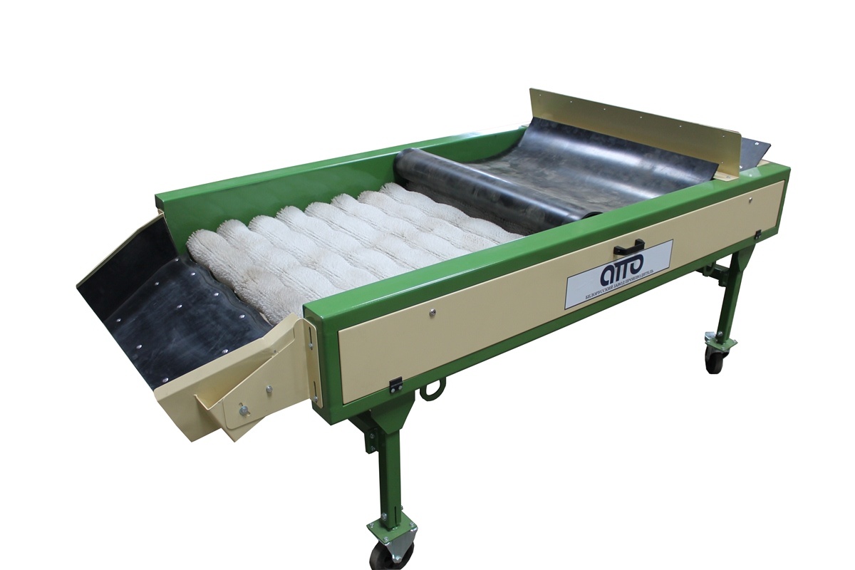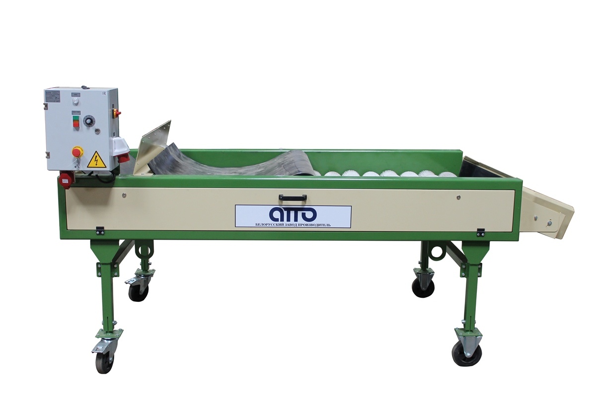 оборудование машина для сухой очистки картофеля и овощей УСО-10 – предназначена для сухой очистки овощей (более щадящей чем мойка) от земли, чернозема, грязи, песка, глины. Машина cухой очистки придает товарный вид таким продуктам как: картофель, морковь, свекла, а также лука от отшелушивающейся кожуры. Овощи вручную или автоматически с помощью лотка или Приемного бункера БП-10 подаются на вращающиеся круглые (волнообразные) полиамидные щётки, где очищаются и, с помощью сетка-держателя поступают в упаковочную тару или поступают с помощью выгрузного лотка на инспекционный конвейер (сортировочно-переборочный стол). На Машине Сухой очистки установлен частотный преобразователь для регулировки скорости движения щеток (он установлен для того чтобы предохранить травму при очищении продукта щетками). Очистка овощей предохраняет их от гниения при длительном хранении и придаёт им товарный вид перед реализацией. Машина сухой очистки имеет максимальное количество щеток-16шт. Машина сухой очистки изготавливается в двух вариантах: 1. С сетка-держателями на 4 сетки, 2. Свыгрузным лотком. Как дополнительная опция на машине сухой очистке может устанавливаться пылеулавливатель (отсос пыли-грязи в мешки).