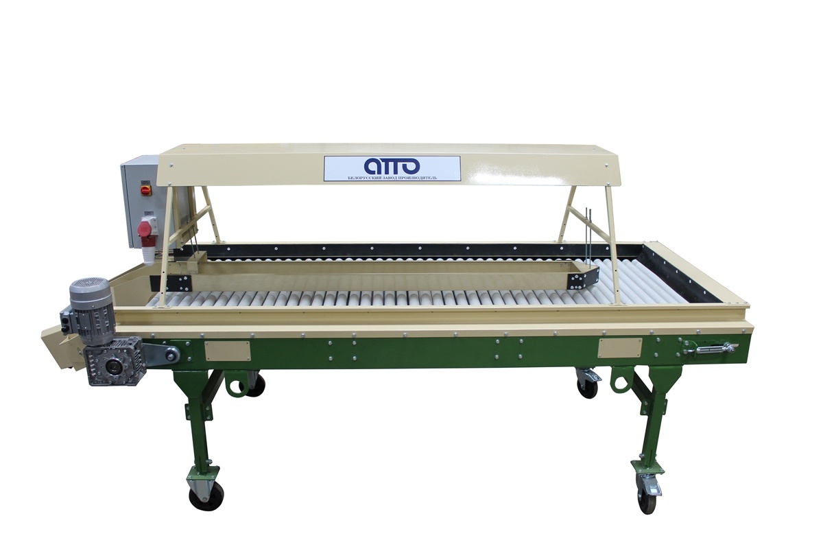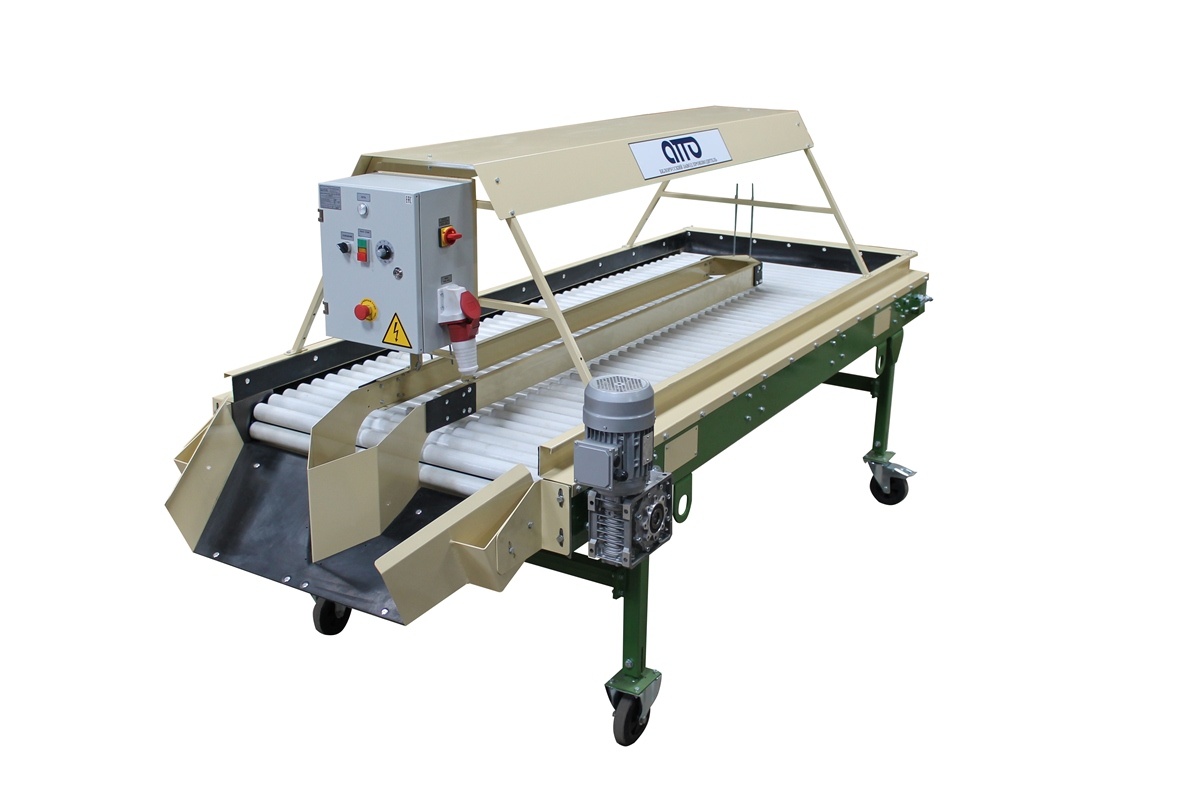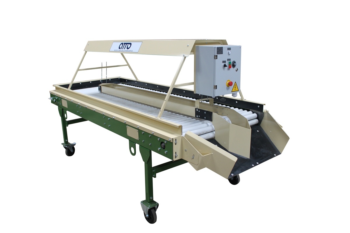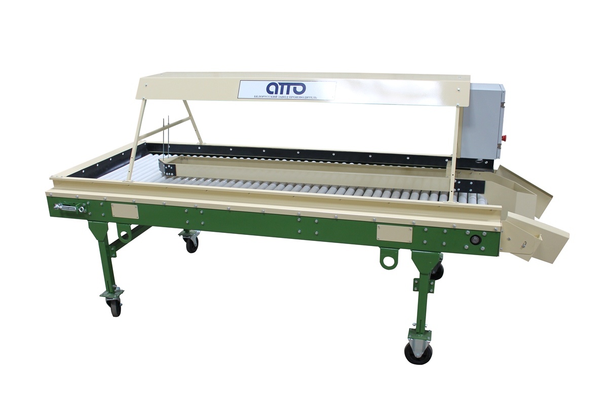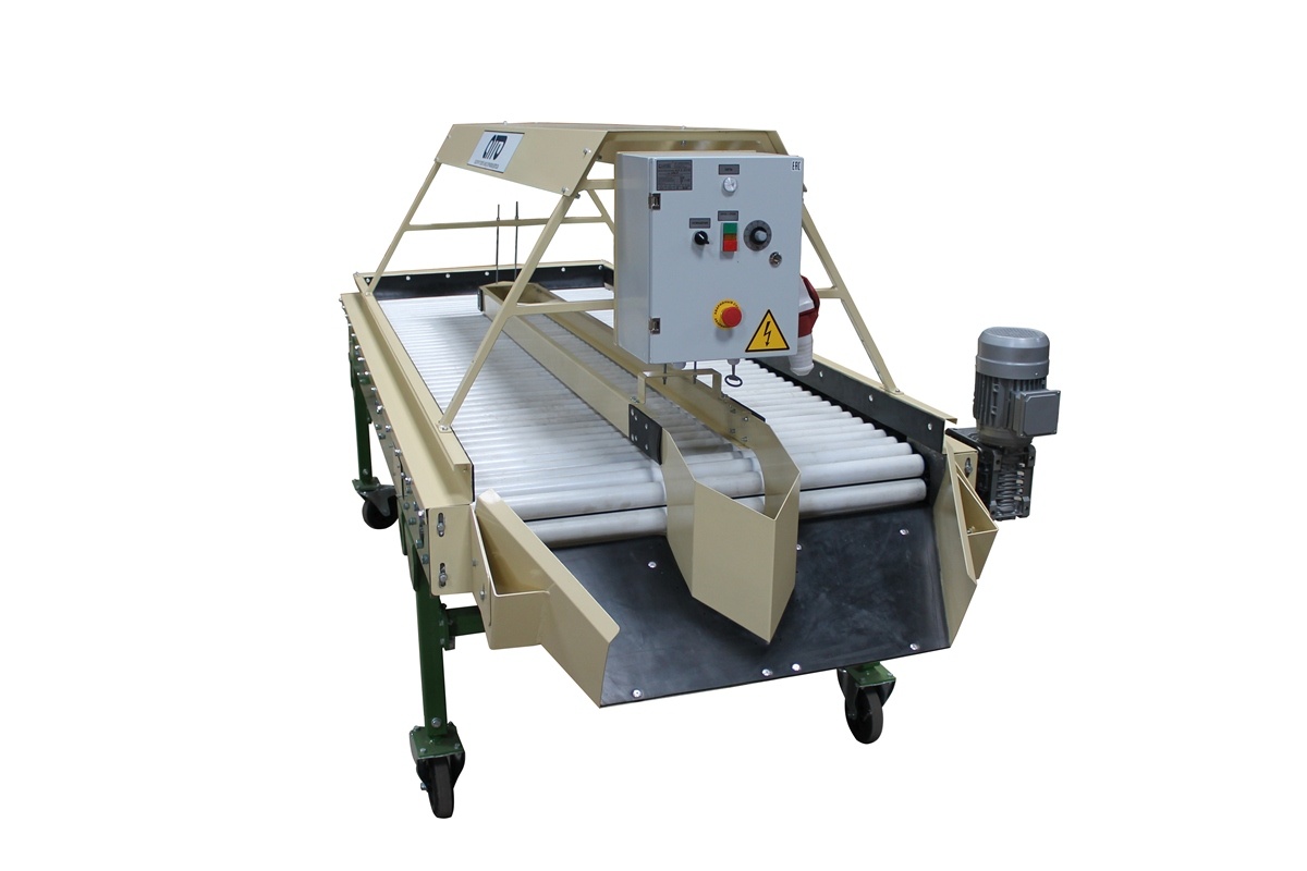 Сортировочный-переборочный стол для картофеля и овощей КРИ-10 – предназначен для ручной инспекции овощей, картофеля, лука, моркови, редиски, свеклы, фруктов, цитрусов, мандаринов, апельсинов. Некачественные (подгнившие, нестандартные, битые и т д.) овощи помещаются в разделитель, находящийся в центральной части конвейера, откуда автоматически попадают на отводящий наклонный транспортёр или в специальную тару (контейнер). Качественные овощи перемещаются далее по линии по переработки овощей или отводятся для упаковки в сетки, мешки, пакеты (сетка-держатель на 4 сетки). В зону сортировки овощи подаются автоматически с помощью вращающихся роликов. Сортировочный переборочный стол установлен на колёсных опорах (мобильный). Имеется плавная регулировка конвейера по высоте. На Сортировочном столе установлен частотный преобразователь для регулировки скорости движения роликов. Имеется освещение по желанию заказчика (входит в стоимость стола). Сортировочный стол изготавливается в двух вариантах: 1. С сетка-держателями на 4 сетки., 2. С выгрузным лотком.