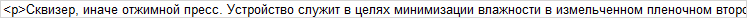 Сквизер, иначе отжимной пресс. Устройство служит в целях минимизации влажности в измельченном пленочном вторсырье. Сквизер отличается от агломераторов тем, что он экономизирует до 80% электроэнергии. Сквизер используется для линии переработки плёнки, которую нужно прежде всего промыть. Так же сквизер на выходе делает капсулят - подпрессованные комочки пленки, а у агломераторов получается агломерат - измельчённая запечённая крошка. Процедура отжима влаги из мытой плёнки является безпрерывным, а не порциональным, как в агломераторах. Не таким энергозатратным, как на агломераторах или на сушильных машинах. Сырье обрабатываемое сквизером, являются мягкие отходы ПВД, ПНД, стрейч плёнки и полипропилена. |