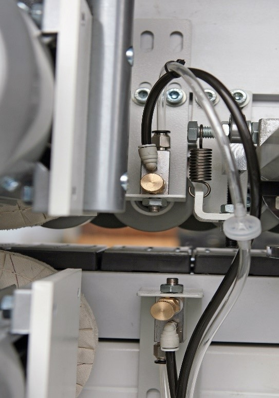 - Фрезерный узел для снятия свесов с вертикальной и горизонтальной настройкой, с двумя высокочастотными двигателями по 0,75 кВт. Радиус фрезы 2 мм;
