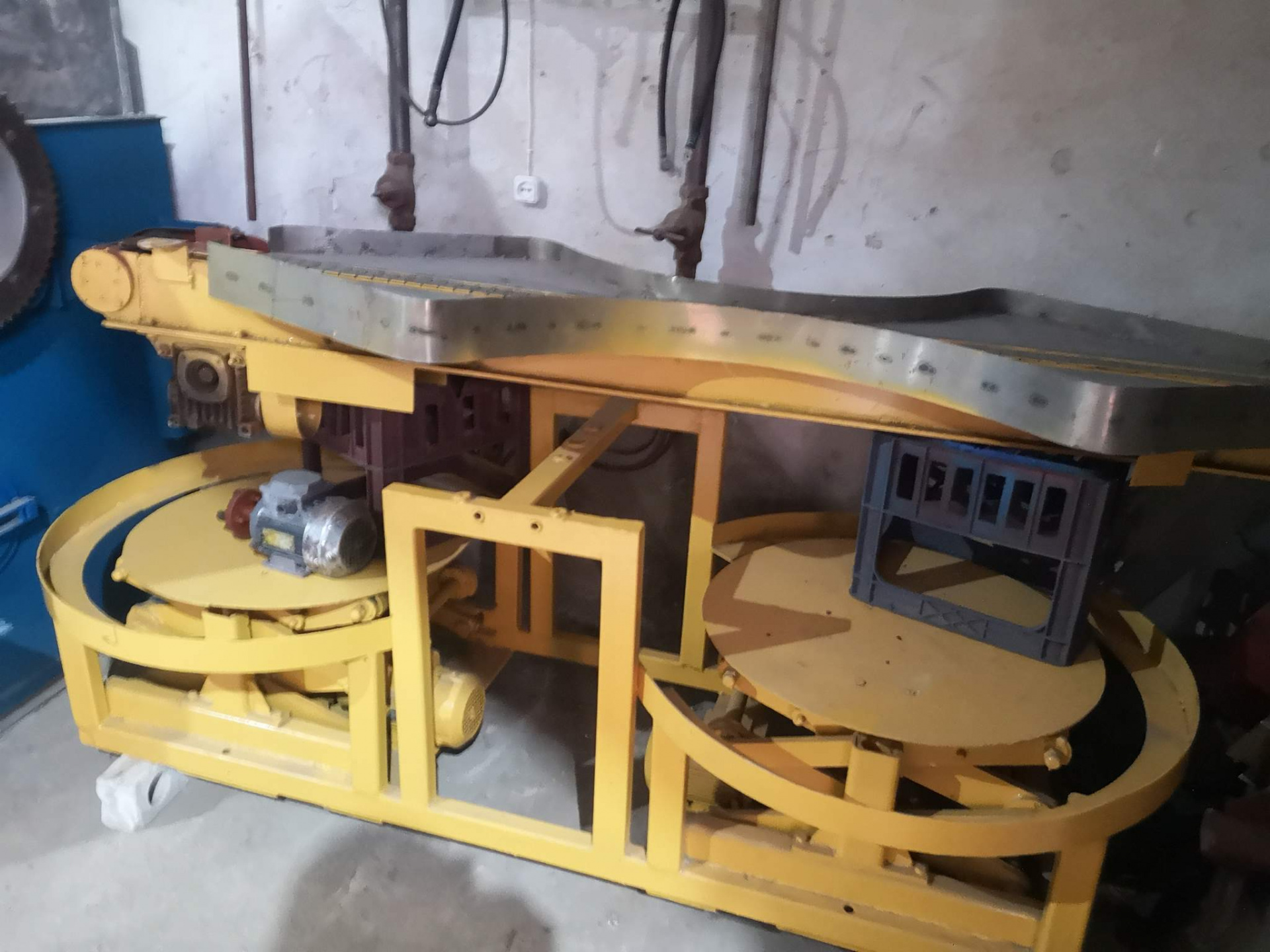Конвейер пластинчатого типа, состоящий из металлических (нержавеющая сталь) звеньев, с приводом от электродвигателя с помощью червячного редуктора и цепной передачи перемещает банки с продуктом к автоклавным корзинам, установленным на раме при загрузке, или банки для дальнейшей технологической обработки при выгрузке.