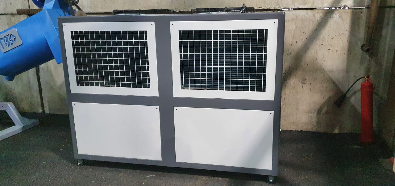 Чиллеры с воздушным охлаждением конденсатора выпускаются в моноблочном исполнении, когда все элементы чиллера находятся в одном блоке, Хладопроизвод. (ккал/ч) -3786 ккал/час, Мощность компрессора-10 кВт, Объем воздуха-26640 м3/ч, производительность - 43786 ккал/час