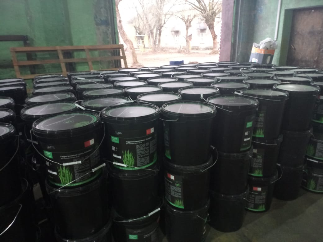 Состав материалов для гидропосева: закрепитель мульчи GumFlex, ускоритель роста FastSoil, удобрение стартовое SpeedSoil, гидрогель мелкой фракции RainDrop,красящий агент Emerald.