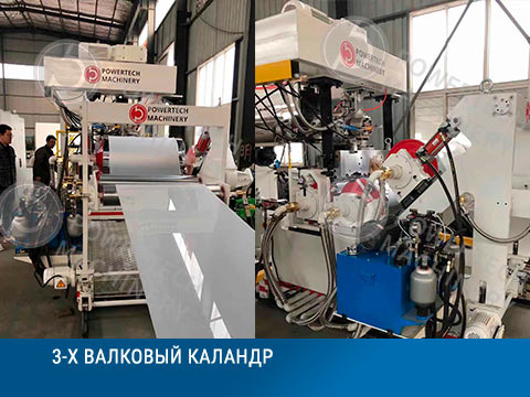 Каландровую систему валов, которая служит для калибровки толщины листа. Каждый вал оснащен мотор-редуктором с частотным регулированием оборотов вращения. В зависимости от выпускаемого листа можно использовать трех валковый или четырех валковый каландр. Валы хромированы и отполированы, а также оснащены жидкостным контуром для терморегулировки. Прижим валов каландра осуществляется гидравлическим или электрическим способом.