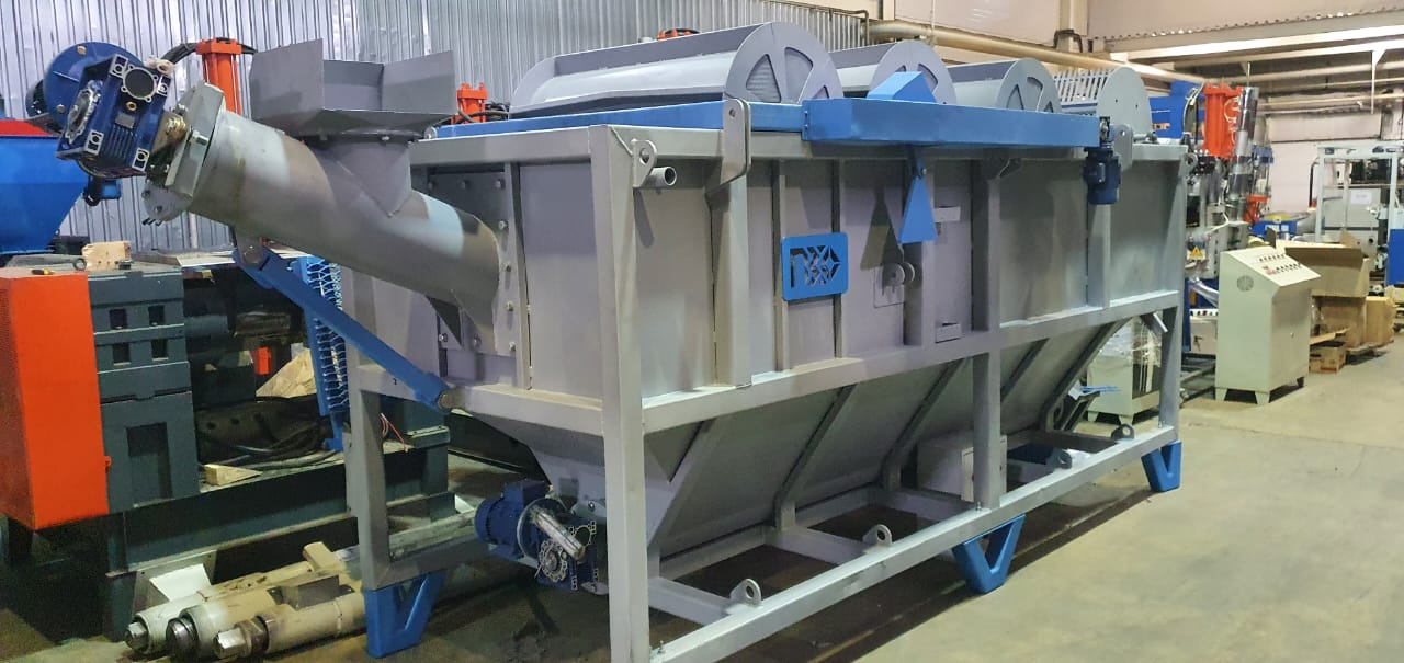 Сырье с отрицательной плавучестью перемещается установленным снизу шнеком к другому концу ванны, отделяется от плавучих материалов и попадает в зону выгрузки. В зоне выгрузки сырье подхватывается наклонным шнековым транспортером и выгружается для дальнейших операций.