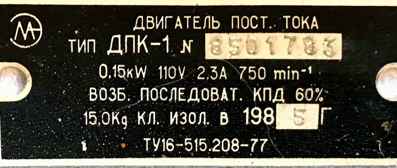 *Двигатель постоянного тока тип "ДПК-1" 0,15 kW; 110 V; 2,3 А; 750 min-1. Возбуждение последовательное. КПД 60%. Вес- 15,0кг. Класс изоляции В. Выпуск 1985 года. ТУ16-515.208-77. Без тормоза.