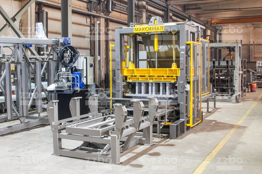 Основное отличие от базового вибропресса МАКСИМАЛ заключается в установке в конце приемного рольганга гидроподъемника для сбора поддонов с готовой продукцией.