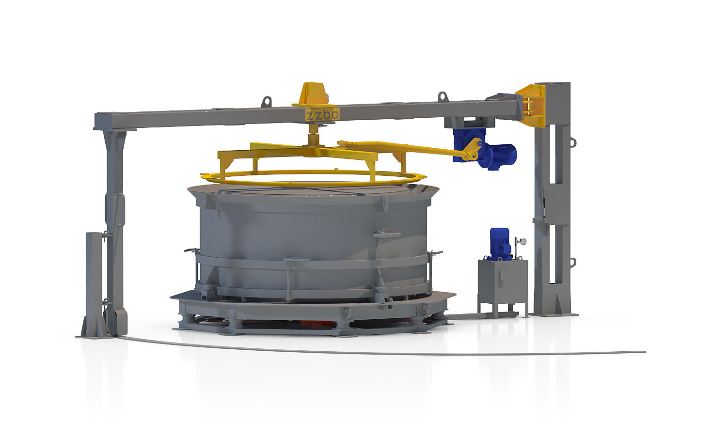 Поворотная балка с затирочным пуансоном перемещается по радиусу на 90 градусов по рельсовому пути. В рабочий момент изготовления пуансон находится над формой, а при распалубке отодвигается в бок.