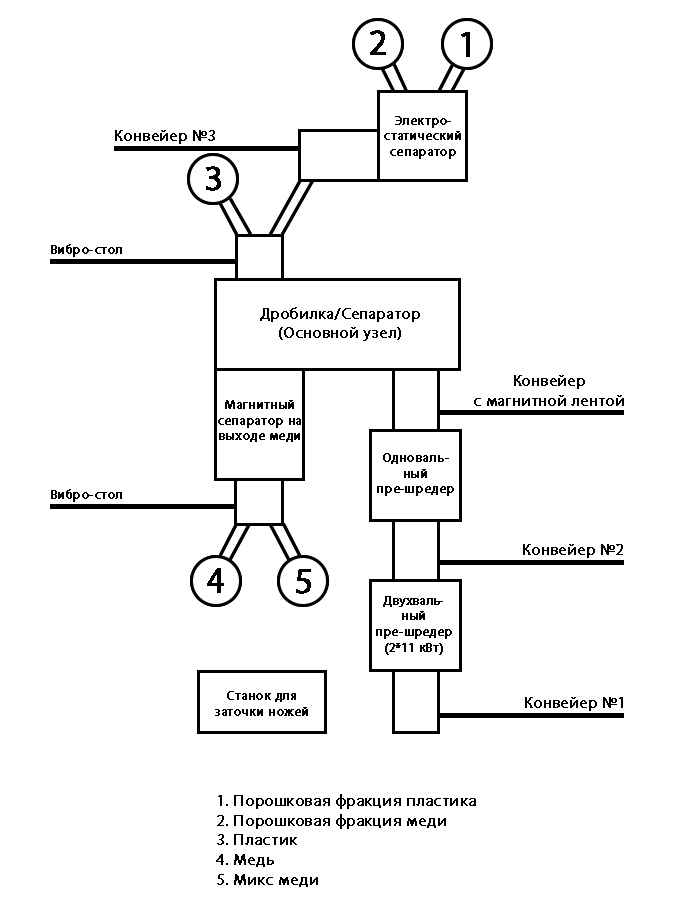 Установку для переработки кабеля MGS-800-03 можно назвать мини-заводом, который обрабатывает изделия из цветных металлов. В нее уже входит двухвальный и одновальный пре-шредер, а также два загрузочных конвейера, магнитный сепаратор для отделения черных металлов и электростатический сепаратор для максимальной степени очистки. Это минимизирует время для подготовки сырья и на практике процесс сортировки исключается.