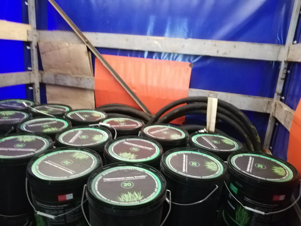 Cостав материалов для гидропосева: закрепитель мульчи GumFlex (ГумФлекс), ускоритель роста FastSoil (ФастСоил), удобрение стартовое SpeedSoil (СпидСоил), гидрогель мелкой фракции RainDrop (РаинДроп), красящий агент Emerald (Изумруд).