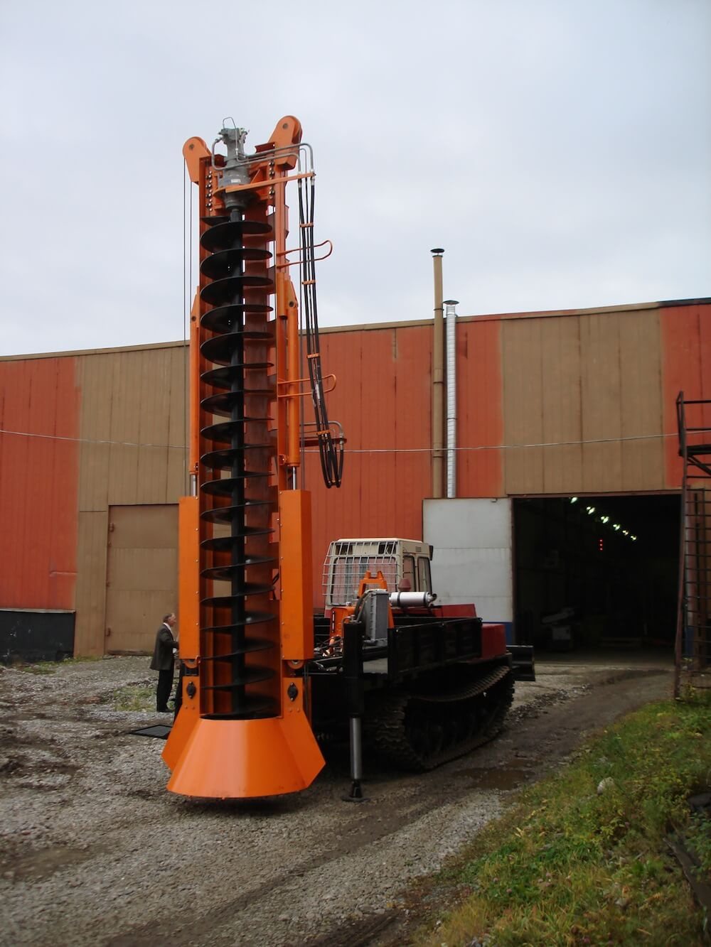 - Специальный защитный раструб предохраняет устье скважины от засыпки во время бурения. Также он необходим для очистки отверстия от грунта после завершения работы при переводе мачты в транспортное положение.