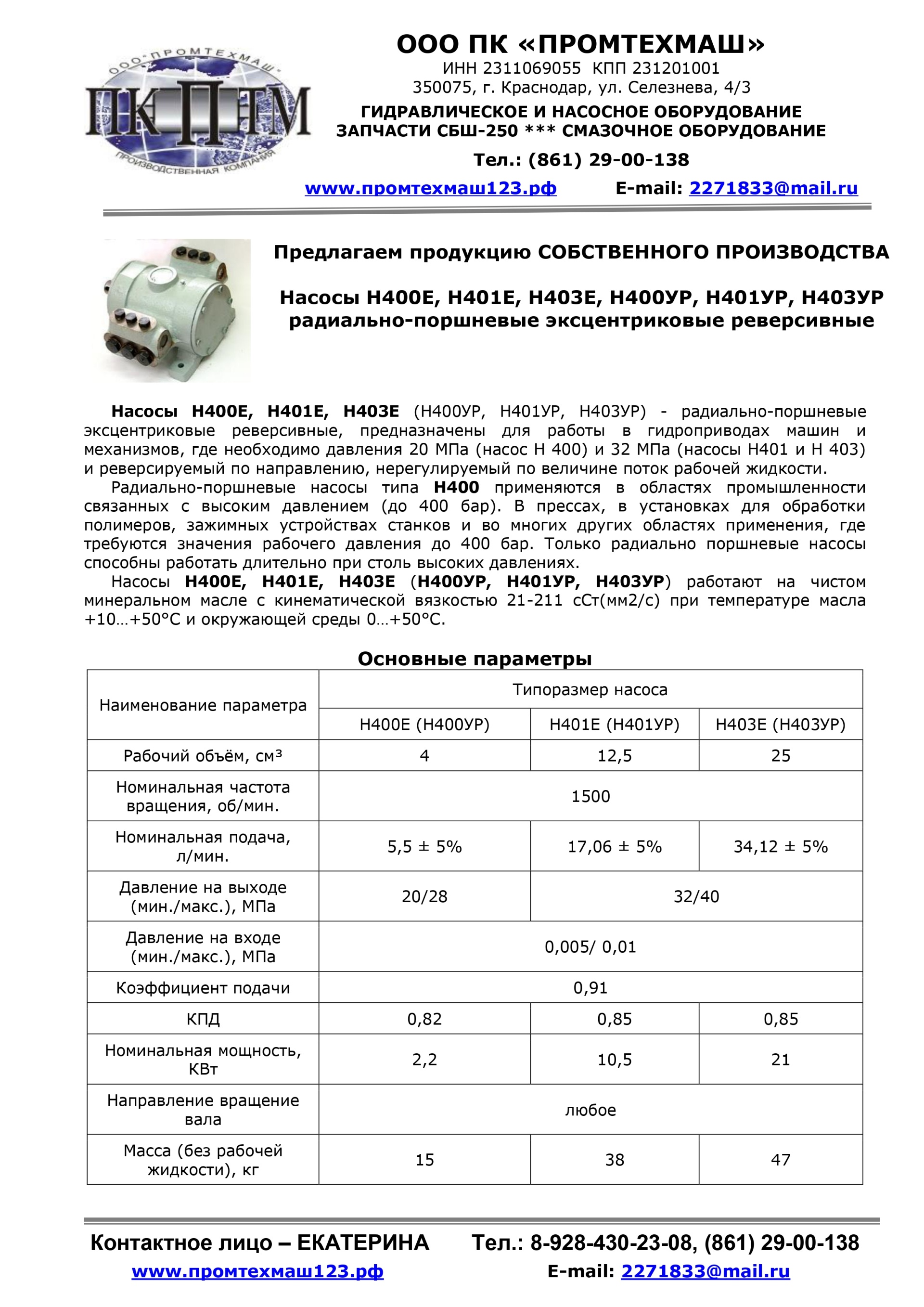 Насосы Н400Е, Н401Е, Н403Е, Н400У, Н401У, Н403У, Н400УР, Н400УР, Н401УР, Н403УР