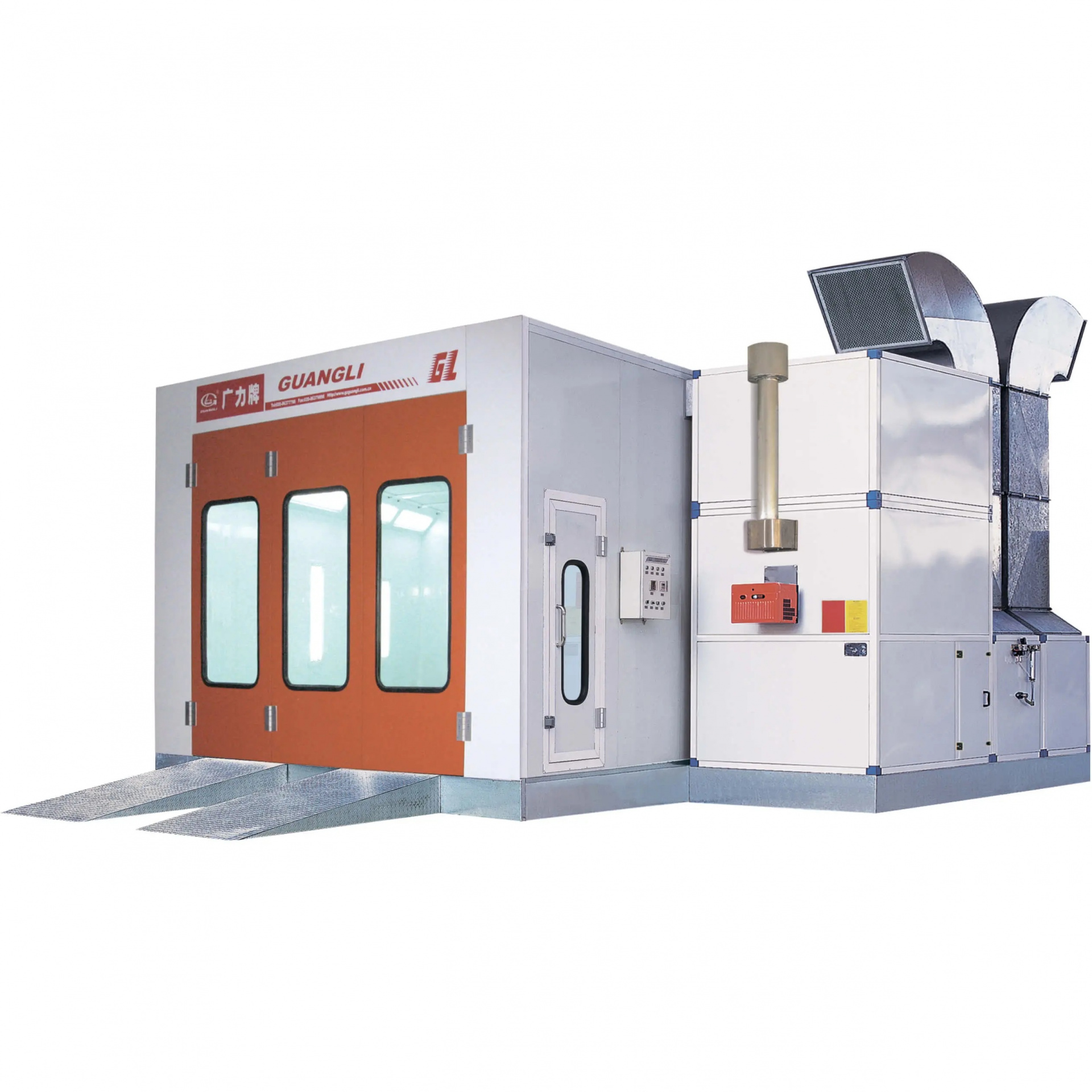 Окрасочно-сушильная камера Guangli GL3 имеет в своей основе металлическое основание высотой 30 см. Напольные решётки выдерживает нагрузку до 600 кг на одно колесо. В стандартном исполнении камера Guangli GL3 комплектуется дизельной горелкой из нержавеющей стали Riello G20 итальянского производства. Мощность горелки составляет 202 кВт, 90 % нагретого воздуха подвергается рециркуляции. Корпус камеры собирается из сэндвич-панелей толщиной 50 мм. В качестве наполнителя используется пенополистирол, опционально можно в качестве наполнителя использовать минеральную вату. Фронтальная дверь покрасочной камеры состоит из 3-х створок, аварийная дверь находится сбоку камеры, она оборудована пневматическим затвором.
