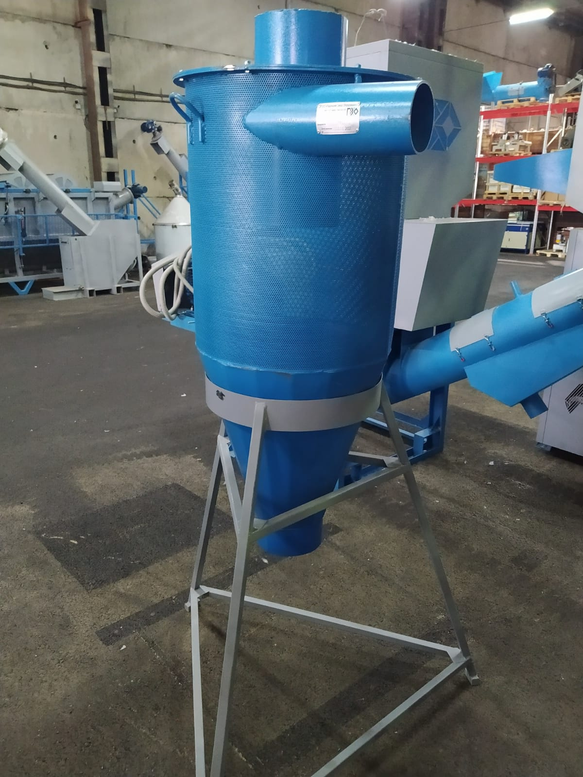 Используется для отделения влаги и мелкой грязи от измельченного полимерного материала. Это оборудование с перфорированными стенками, через которые отделяется грязная вода во время раскручивания центрифуги и возникновения центробежных сил. Под действием этих сил воздух выходит через верхний патрубок, а очищенный материал опускается и выводится через нижнее сопло. Осушитель работает совместно с центробежным вентилятором.
