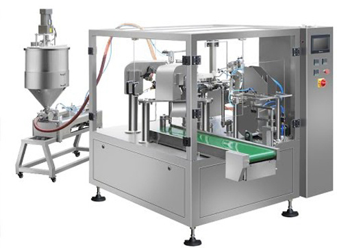 На автомате продукт дозируется в готовый реторт, дой-пак пакет с последующей выгрузкой готового пакета. Предусмотрен контроль раскрытия пакета вакуумными присосками.