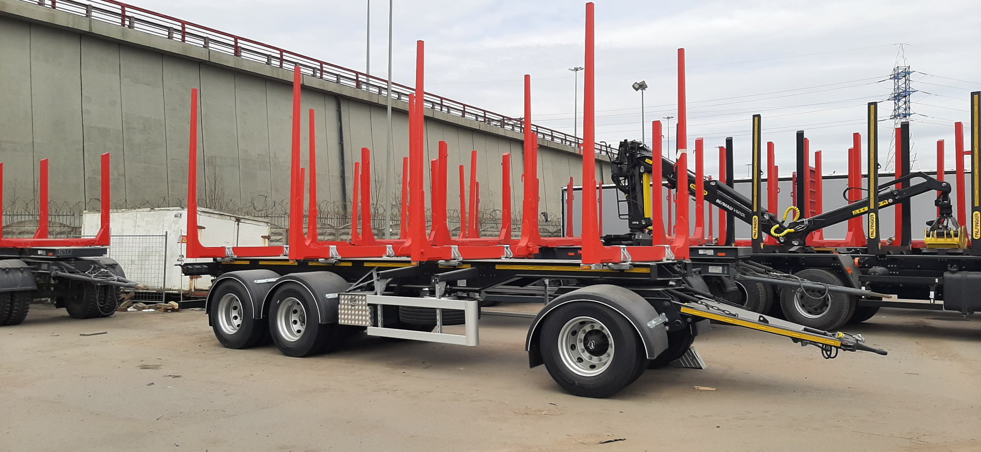 Прицеп сортиментовозный модель 600327 (длина 8м; 3-х осный; 2-х скатный; оси Турция 12тн; резина 295/80R22,5 Lanvigator (Китай, бескам.); коник сорт. II типа (h=2,65м, сталь S700MC) – 4шт, лебедка тросовая – 4шт; подвеска рессорная; рессоры Springer 12-листовые; без ABS; поворотный круг BPW 20тн; длина дышла 2000мм; европетля; положение дышла 910мм; головка палм; год изготовления ТС – 2022 г