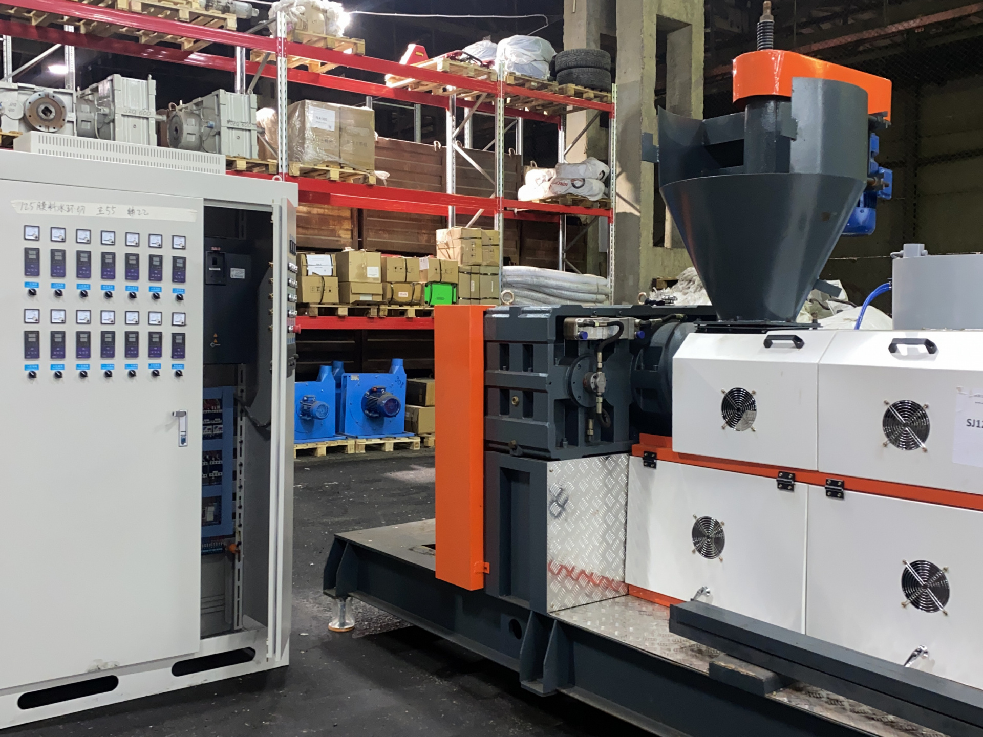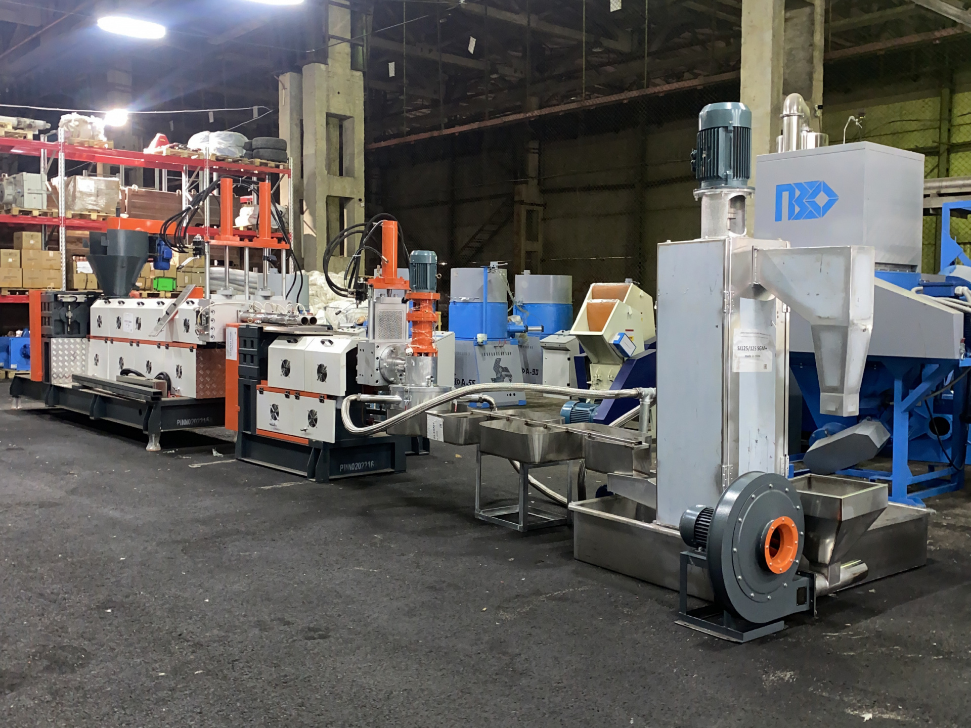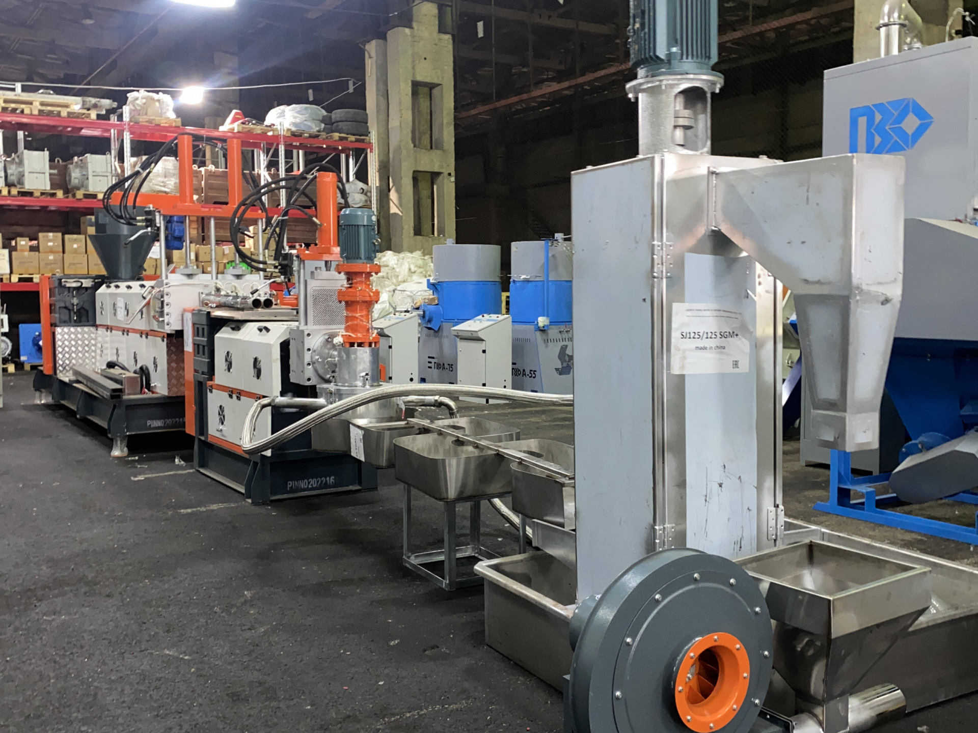 Второй каскад 22 кВт, азотированный шнек, диаметр 125, длина 1150 (LD 1/9,2) Гранулятор оснащен бункером принудительной загрузки, центрифугой для сушки гранулы и пневмовыгрузом с накопителем. На первом и втором каскадах гидравлические фильтры. Дополнительные фото по запросу.