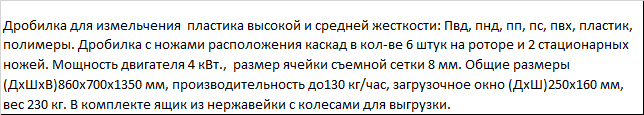 | Дробилка для измельчения пластика высокой и средней жесткости: Пвд, пнд, пп, пс, пвх, пластик, полимеры. Дробилка с ножами расположения каскад в кол-ве 6 штук на роторе и 2 стационарных ножей. Мощность двигателя 4 кВт., размер ячейки съемной сетки 8 мм. Общие размеры (ДхШхВ)860x700x1350 мм, производительность до130 кг/час, загрузочное окно (ДхШ)250x160 мм, вес 230 кг. В комплекте ящик из нержавейки с колесами для выгрузки. |