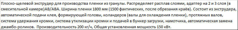 | Плоско-щелевой экструдер для производства пленки из гранулы. Распределяет расплав слоями, адаптер на 2 и 3 слоя (в смесительной камере)АВ/АВА. Ширина пленки 1800 мм (1500 фактических, после обрезания краёв). Состоит из экструдера, автоматической подачи клея, формирующей головы, коландеров (валы для охлаждения пленки), протяжных валов, система удержания кромки, система утилизации кромки и подачей в бункер загрузки, намотчика, автоматическая замена джамбо-роликов. Производительность 200 кг/ч, Общая установленная мощность 150 кВт. |