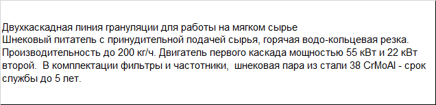 | Двухкаскадная линия грануляции для работы на мягком сырье Шнековый питатель с принудительной подачей сырья, горячая водо-кольцевая резка. Производительность до 200 кг/ч. Двигатель первого каскада мощностью 55 кВт и 22 кВт второй. В комплектации фильтры и частотники, шнековая пара из стали 38 CrMoAl - срок службы до 5 лет. |