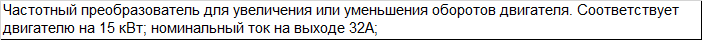| Частотный преобразователь для увеличения или уменьшения оборотов двигателя. Соответствует двигателю на 15 кВт; номинальный ток на выходе 32А; |