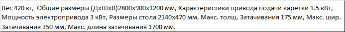 | Вес 420 кг, Общие размеры (ДхШхВ)2800x900x1200 мм, Характеристики привода подачи каретки 1.5 кВт, Мощность электропривода 3 кВт, Размеры стола 2140x470 мм, Макс. толщ. Затачивания 175 мм, Макс. шир. Затачивания 350 мм, Макс. длина затачивания 1700 мм. |