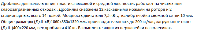 | Дробилка для измельчения пластика высокой и средней жесткости, работает на чистых или слабозагрязненных отходах . Дробилка снабжена 12 каскадными ножами на роторе и 2 стационарных, всего 14 ножей. Мощность двигателя 7,5 кВт., калибр ячейки съемной сетки 10 мм. Общие размеры (ДхШхВ)1060x880x1320 мм, производительность до 200 кг/час, загрузочное окно (ДхШ)400x220 мм, вес дробилки 410 кг. В комплекте ящик из нержавейки на колесиках. |