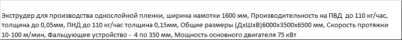 | Экструдер для производства однослойной пленки, ширина намотки 1600 мм, Производительность на ПВД до 110 кг/час, толщина до 0,05мм, ПНД до 110 кг/час толщина 0,15мм, Общие размеры (ДхШхВ)6000x3500x6500 мм, Скорость протяжки 10-100 м/мин, Фальцующее устройство - 4 по 350 мм, Мощность основного двигателя 75 кВт |