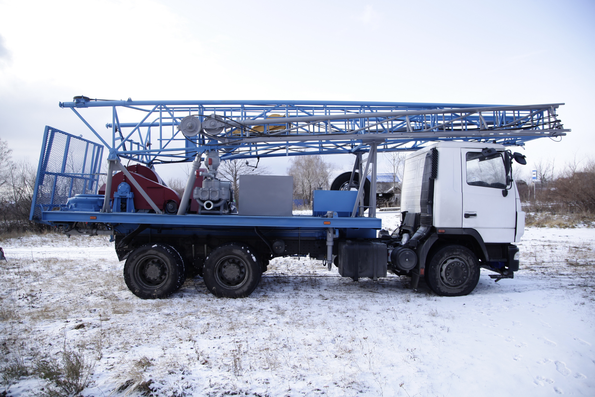Буровой блок (ротор Р-410, лебёдка однобарабанная 51 Кн, мачта высотой 18,6 метров, буровой насос НБ-50, вертлюг 196 Кн, кронблок, штропа ШЭ-28, квадрат 80*80мм 9м, рабочая площадка, освещение мачты и площадки, вспомогательная лебёдка 2,5тн) на шасси УРАЛ-4320 или ином.
