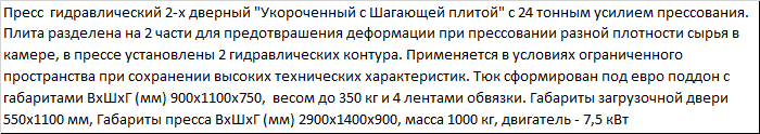 | Пресс гидравлический 2-х дверный "Укороченный с Шагающей плитой" с 24 тонным усилием прессования. Плита разделена на 2 части для предотвращения деформации при прессовании разной плотности сырья в камере, в прессе установлены 2 гидравлических контура. Применяется в условиях ограниченного пространства при сохранении высоких технических характеристик. Тюк сформирован под евро поддон с габаритами ВxШxГ (мм) 900x1100x750, весом до 350 кг и 4 лентами обвязки. Габариты загрузочной двери 550х1100 мм, Габариты пресса ВxШxГ (мм) 2900x1400x900, масса 1000 кг, двигатель - 7,5 кВт |