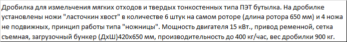| Дробилка для измельчения мягких отходов и твердых тонкостенных типа ПЭТ бутылка. На дробилке установлены ножи "ласточкин хвост" в количестве 6 штук на самом роторе (длина ротора 650 мм) и 4 ножа не подвижных, принцип работы типа "ножницы". Мощность двигателя 15 кВт., привод ременной, сетка съемная, загрузочный бункер (ДхШ)420x650 мм, производительность до 400 кг/час, вес дробилки 900 кг. |