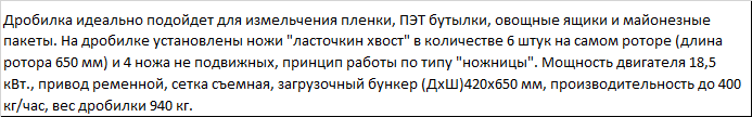 | Дробилка идеально подойдет для измельчения пленки, ПЭТ бутылки, овощные ящики и майонезные пакеты. На дробилке установлены ножи "ласточкин хвост" в количестве 6 штук на самом роторе (длина ротора 650 мм) и 4 ножа не подвижных, принцип работы по типу "ножницы". Мощность двигателя 18,5 кВт., привод ременной, сетка съемная, загрузочный бункер (ДхШ)420x650 мм, производительность до 400 кг/час, вес дробилки 940 кг. |
