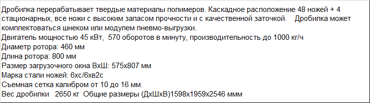 | Дробилка перерабатывает твердые материалы полимеров. Каскадное расположение 48 ножей + 4 стационарных, все ножи с высоким запасом прочности и с качественной заточкой. Дробилка может комплектоваться шнеком или модулем пневмо-выгрузки. Двигатель мощностью 45 кВт, 570 оборотов в минуту, производительность до 1000 кг/ч Диаметр ротора: 460 мм Длина ротора: 800 мм Размер загрузочного окна ВхШ: 575х807 мм Марка стали ножей: 6хс/6хв2с Съемная сетка калибром от 10 до 16 мм. Вес дробилки 2650 кг Общие размеры (ДхШхВ)1598x1959x2546 ммм |