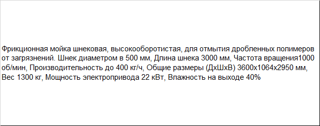 | Фрикционная мойка шнековая, высоко оборотистая, для отмытия дробленных полимеров от загрязнений. Шнек диаметром в 500 мм, Длина шнека 3000 мм, Частота вращения1000 об/мин, Производительность до 400 кг/ч, Общие размеры (ДхШхВ) 3600x1064x2950 мм, Вес 1300 кг, Мощность электропривода 22 кВт, Влажность на выходе 40% |