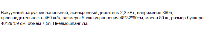 | Вакуумный загрузчик напольный, асинхронный двигатель 2,2 кВт, напряжение 380в, производительность 450 кг/ч, размеры блока управления 48*32*90см, масса 80 кг, размер бункера 40*29*59 см, объём 7,5л, Пневмошланг 7м. |