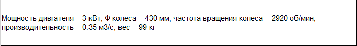 | Мощность дивгателя = 3 кВт, Ф колеса = 430 мм, частота вращения колеса = 2920 об/мин, производительность = 0.35 м3/с, вес = 99 кг |