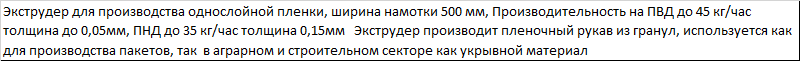 | Экструдер для производства однослойной пленки, ширина намотки 500 мм, Производительность на ПВД до 45 кг/час толщина до 0,05мм, ПНД до 35 кг/час толщина 0,15мм Экструдер производит пленочный рукав из гранул, используется как для производства пакетов, так в аграрном и строительном секторе как укрывной материал |