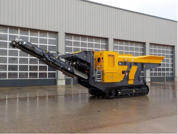 Мобильная дробилка на гусеничном шасси с магнитным блоком для отсортировки металла.