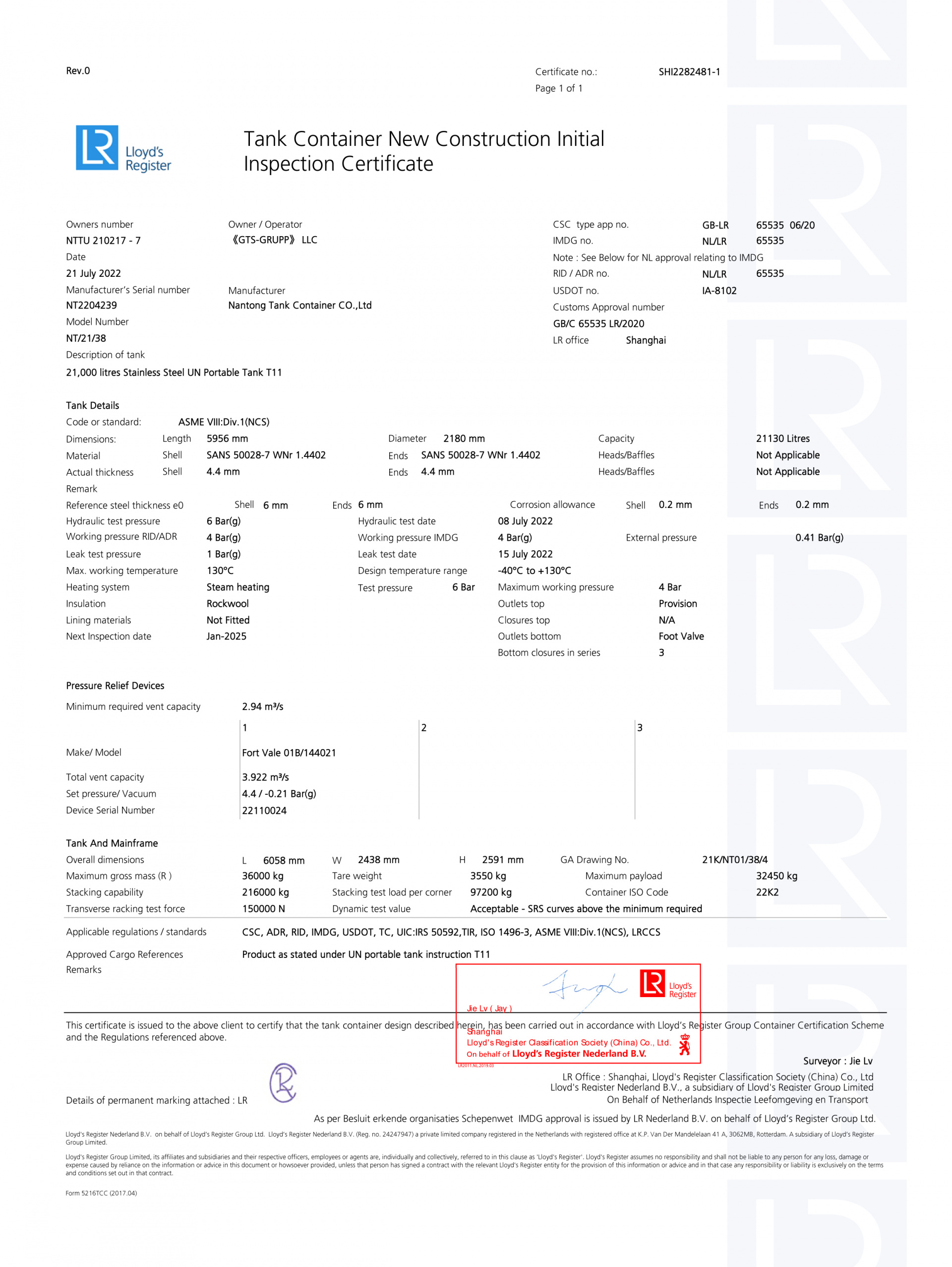 | Материал цистерны | Нержавеющая сталь SANS 50028-7 WNr 1.4402/1.4404 (C<0.03%), эквивалент 316L |